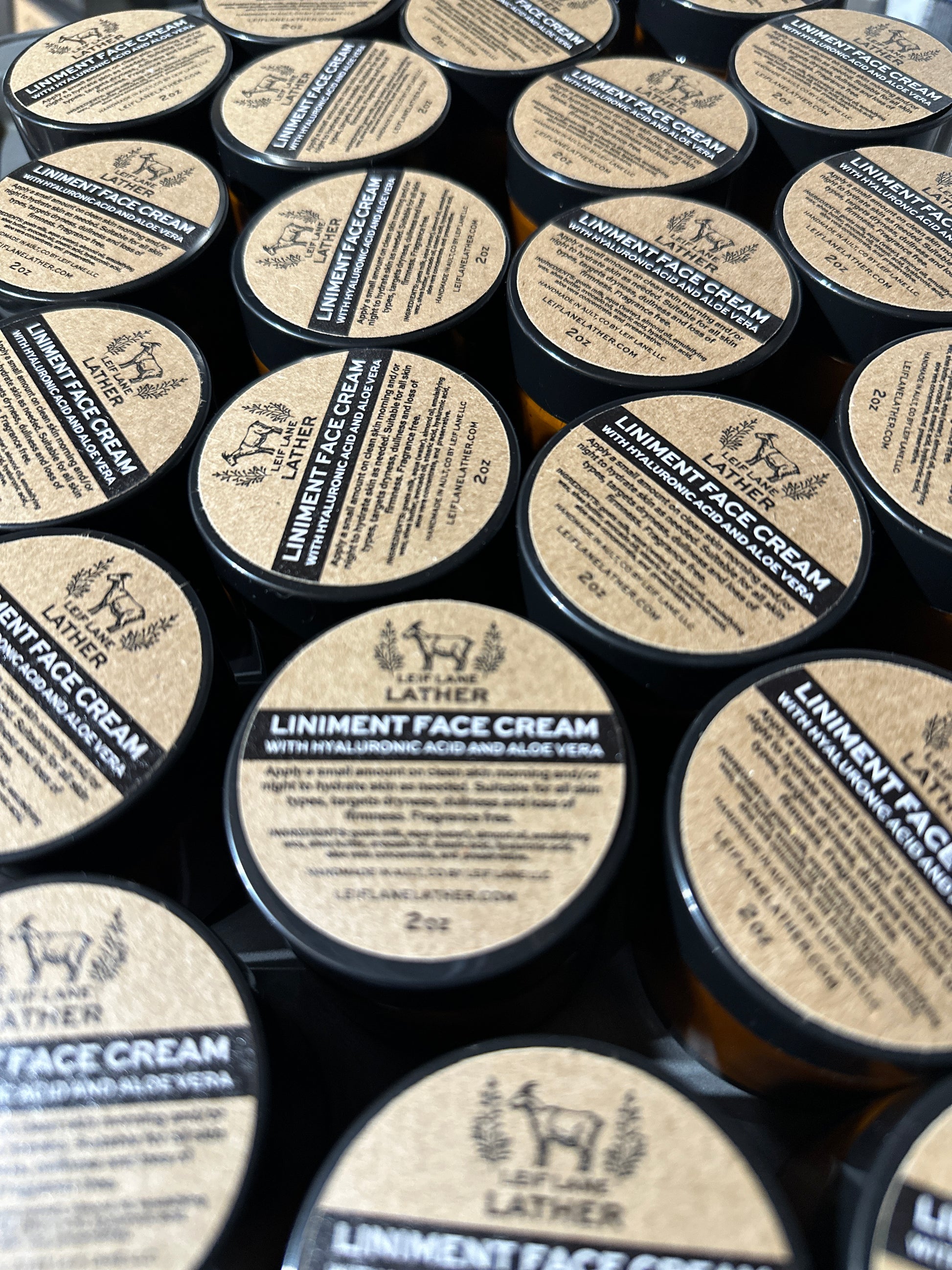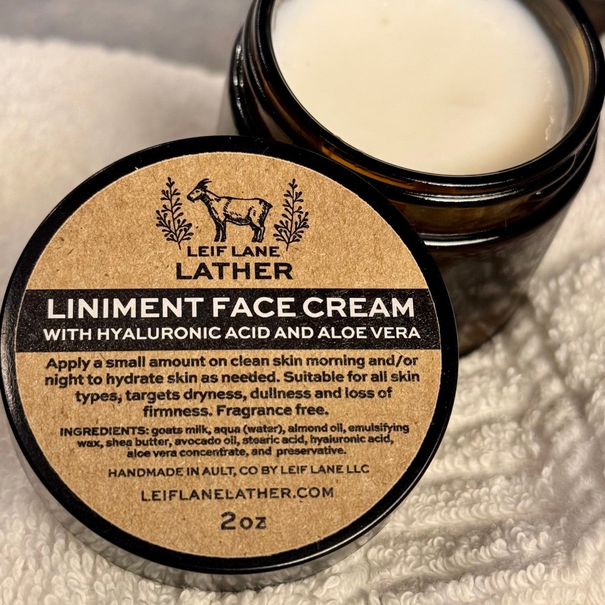 LINIMENT uses natural ingredients to help your skin add and retain its natural moisture. It’s handmade in small batches with goats milk for added Vitamin C, D, B, and A as well as zinc, proteins and fatty acids. It leaves your skin feeling moisturized with a light barrier provided by Hyaluronic Acid, Aloe Vera and Glycerin. Use a small amount day or night as needed.